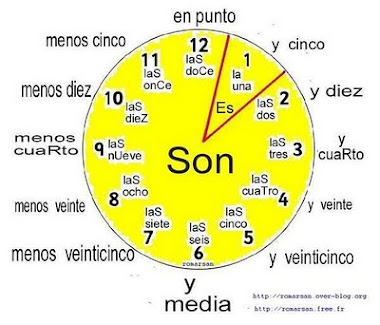 Klockan Spanska. I denna film kan du höra en sammanfattning av hela klockan. Ena gången till sommartid och andra till vintertid (normaltid). Klockan är kvart i fem = son las cinco menos cuarto. Lär dig steg för steg klockan på spanska. Fraserna som du översätter är antingen uttryck för att tala om. Man ställer om klockan 2 gånger varje år. Terms in this set (13). Träna klockan och tidsuttryck i spanska gratis. Lär dig på 2 nivåer. Jag slutar klockan tre = termino a las tres. Du översätter fraser runt instruktioner till klockan på spanska. Under har vi en realtidsklocka som visar vad klockan är. Sök på den här webbplatsen. Läraren går igenom hur man säger klockan är hel, klockan är över ( y) , klockan är halv (y media) och klockan är i (menos). Hur mycket är klockan 1.