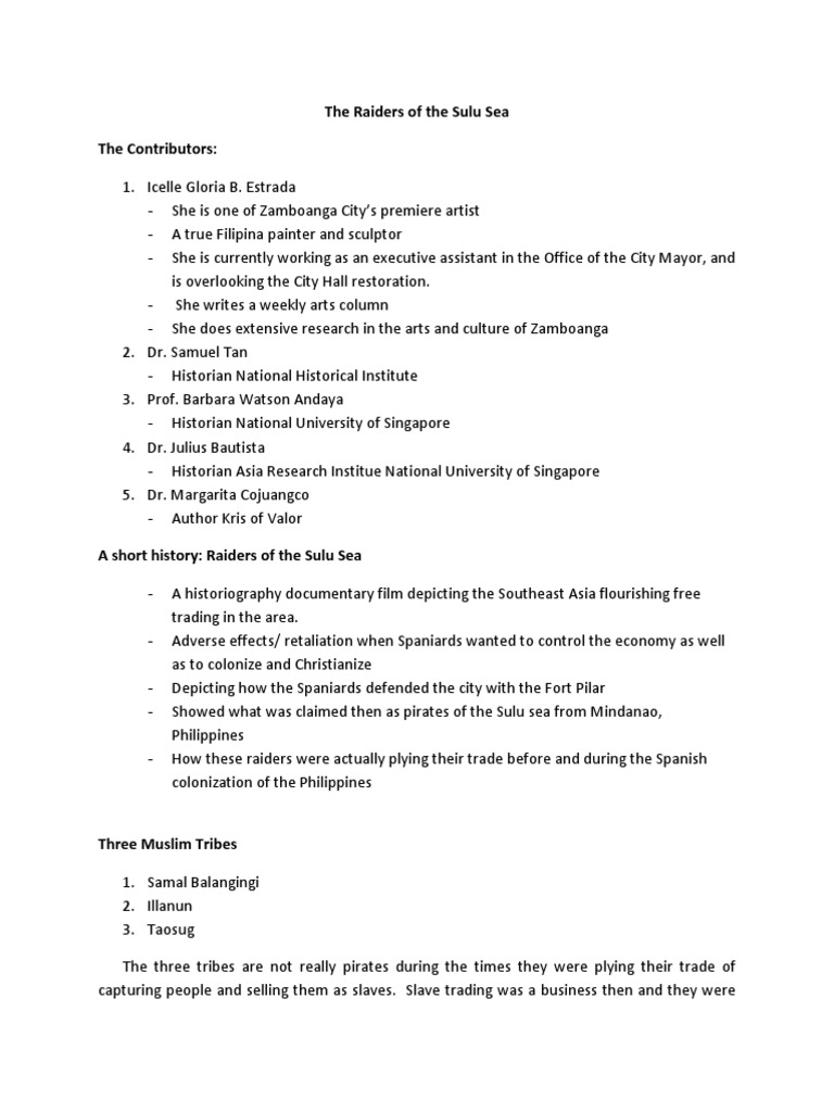 Ged103 Reviewer Docx Ged103 Reviewer Module 1 U2013 Section 1 Distinction Between Primary And Secondary Sources Primary Sources Are Considered As Course Hero. Raiders of the sulu sea. Learn vocabulary, terms and more with flashcards, games and other study tools. Raiders of the sulu sea a historiography documentary film focusing on zamboanga city depicting how the spaniards defended the city with the fort pilar as spain's last stronghold and bastion of defense and economic expansion in the south of the. Start studying raiders of sulu sea. .the sea by james reeves the main idea of the sea by james reeves is that the sea is similar to a dog in so many ways. Documents similar to the raiders of the sulu sea. Hailing from the sulu sea region in the southern regions of the philippines, borneo, java. Raiders of the sulu sea (summary). Reaction paper on the raiders of the sulu sea: Rania lobusta august 17, 2012 ya history 10.1 raiders of the sulu sea (reflection paper) even today, in some places, we all know that no matter what happen. Juan de plasencia's customs of the tagalog. Nuqui, kyle justine roie c. a historiography documentary film depicting the southeast. Reviewer about the raiders of the sulu sea. The film depicts the slave trading business that emerged even before and during.