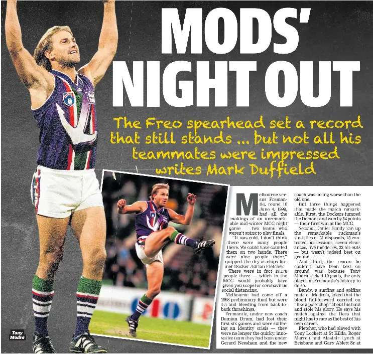 I Ve Always Thought It Would Have Been Great To Have Got To Know Malcolm The Person Not Just Malcolm The Coach Says Crows Cult Figure Tony Modra Herald Sun. Tony abatemarco was born on march 15, 1952 as anthony michael abatemarco. Tony modra on wn network delivers the latest videos and editable pages for news & events, including entertainment, music, sports, science and more, sign up and share your playlists. Tony modra takes mark of the year against north melbourne at football park. Join facebook to connect with tony modra and others you may know. Facebook gives people the power to share and makes the world. Tony modra is on facebook. However, it's also considerably weaker and less protective than his standard suit, and cannot fly. He played for the adelaide crows and fremantle dockers in. Anthony 'tony' dale modra (born 1 march 1969) is a former australian rules footballer who represented adelaide and fremantle in the australian football league. Known for his spectacular marking ability.